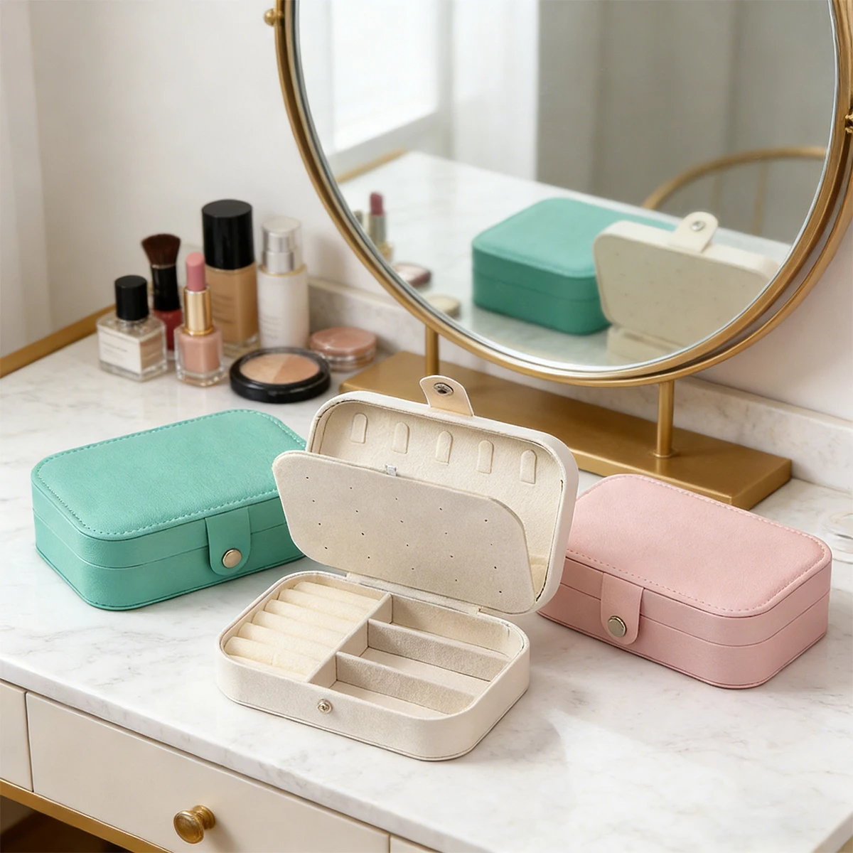 A compact and elegant jewelry box designed to keep your favorite pieces safe and organized. Perfect for travel or everyday storage, it protects your jewelry while keeping everything neatly in place.